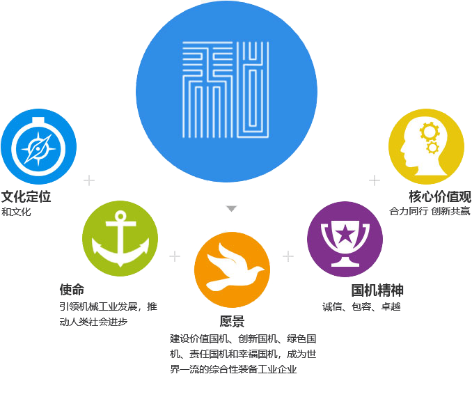 國機集團的企業文化體系建設以“和”文化為核心。這種“和”文化源于中國傳統的價值觀,體現了國機集團“合力同行、創新共贏”的核心價值,是對推動國機集團近年快速發展的先進文化價值的提煉,也是國機集團努力營造和諧、積極、健康、向上的組織氛圍,激發團隊活力,提升協作效率,增強組織向心力、凝聚力、競爭力的需要。國機人以“引領機械工業前進方向,創新機械工業發展道路”為使命,以“機械工業的領跑者,社會價值的創造者”為愿景。這種“和”文化建設,具有鮮明的時代特征, 反映了國機集團貫徹科學發展觀,致力于和諧企業、和諧社會建設的理想和不懈追求。