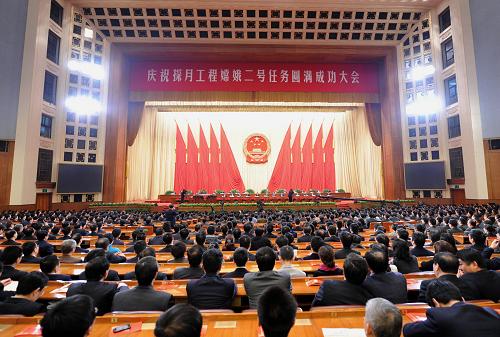 中共中央、國務院和中央軍委于12月20日上午在人民大會堂舉行大會,隆重慶祝我國探月工程嫦娥二號任務圓滿成功。中共中央總書記、國家主席、中央軍委主席胡錦濤發表重要講話。中共中央政治局常委、全國人大常委會委員長吳邦國主持慶祝大會。