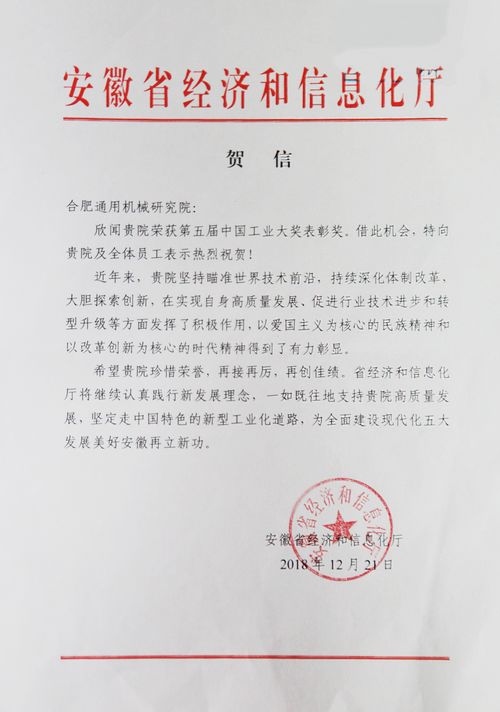 12月21日,安徽省經濟和信息化廳向我院發來賀信,祝賀我院榮獲第五屆中國工業大獎表彰獎,并勉勵我院珍惜榮譽,再接再厲,再創佳績,為全面建設現代化五大發展美好安徽再立新功。